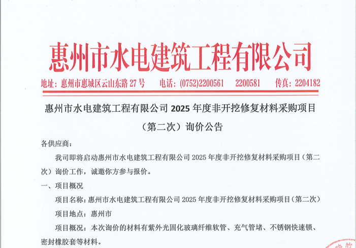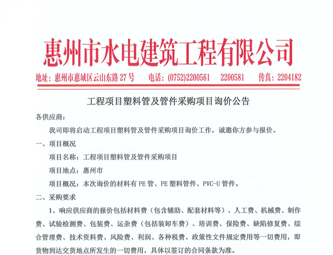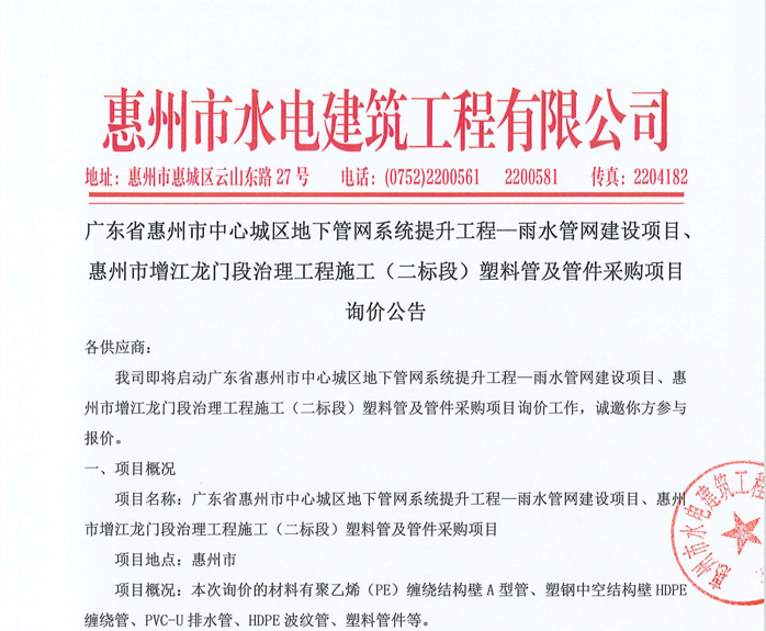 廣東省惠州市中心城區(qū)地下管網(wǎng)系統(tǒng)提升工程—雨水管網(wǎng)建設(shè)項(xiàng)目、惠州市增江龍門段治理工程施工(二標(biāo)段)塑料管及管件采購項(xiàng)目詢價(jià)公告……